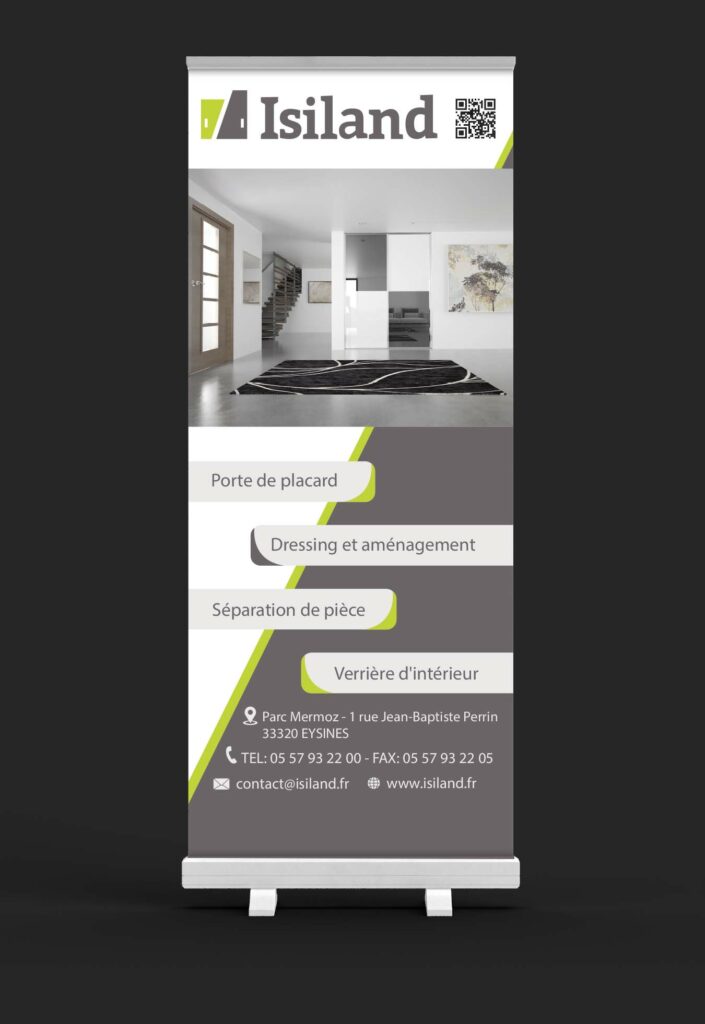 Isiland est une entreprise de fabrication de portes de placard, dressing, aménagement, verrière, sur mesure. Nous avons accompagné ce client dans la création graphique de différents supports de communication tel que des roll-up et des autocollants.