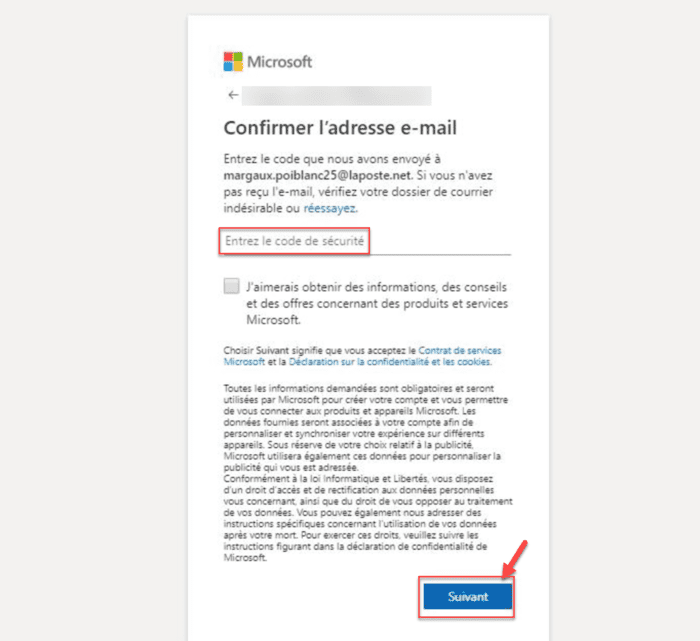 6. Ensuite, il vous faudra confirmer votre adresse mail en entrant le code de sécurité reçu sur votre boite mail.